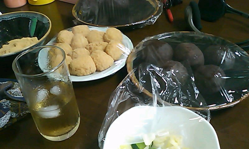 実家の食卓には、ぼた餅、きなこ、 寿司、茹でたとうもろこし、梅ジュース。